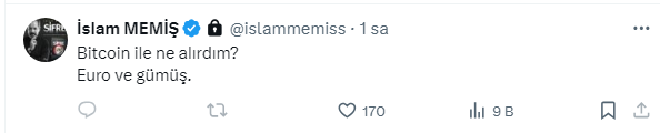 Piyasalarla ilgili peş peşe açıklamalar yapan İslam Memiş, sosyal medya hesabından Altın ve gümüş yorumlarından sonra bitcoine de değindi. Uzman İslam Memiş ''Bitcoin ile ne alırdım?'' sorusuna yanıt olarak euro ve gümüşü söyledi.