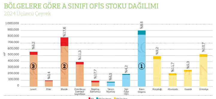 - Gelişmekte olan Ofis Bölgeleri [Kağıthane, Bomonti-Piyalepaşa, Maltepe-Kartal, Batı Ataşehir]: 2024 üçüncü çeyrek dönem sonunda Gelişmekte Olan Ofis Bölgelerinin stok payı yüzde 35 olarak tespit edildi.