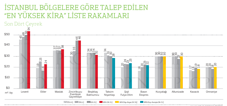 Uzun süredir en yüksek kiranın talep edildiği bölge olan Levent'te, son dört dönemde istikrarlı artışıyla 2024 üçüncü çeyrek sonunda İstanbul'daki en yüksek kiranın 54 ABD Doları /m2/ay olması göze çarptı.