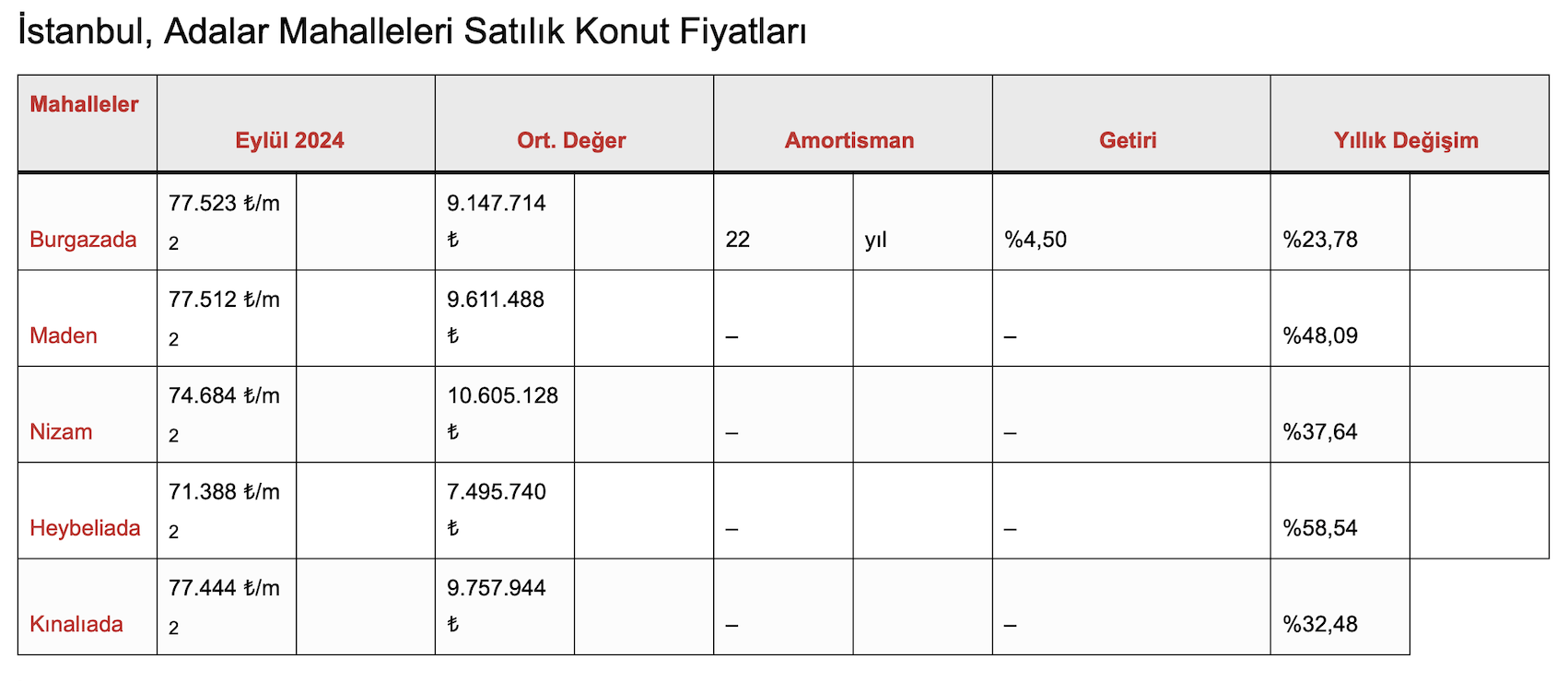 Paylaşılan detaylara göre amortisman süreleri dikkate alındığı zaman Eylül 2024 sonu itibarıyla İstanbul ili Adalar ilçesinde en kısa geri dönüşe sahip mahalleler sırasıyla Maden, Nizam, Heybeliada, Kınalıada, Burgazada olarak açıklandı.