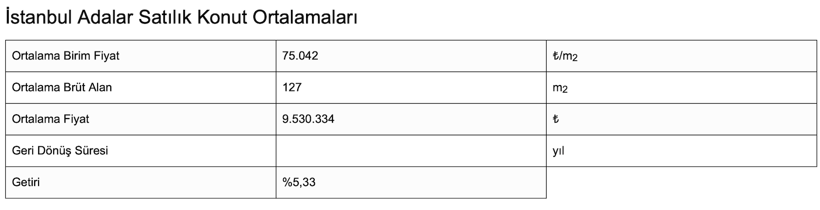 İstanbul Adalar Satılık Konut Ortalamaları