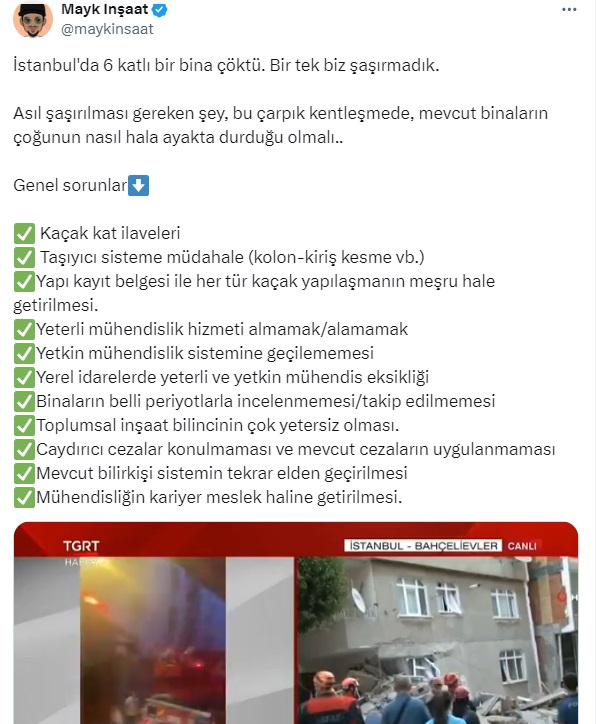 İstanbul'un Bahçelievler ilçesinde Zafer mahallesi Yadigar Sokak'ta bulunan 6 katlı bina çöktü. Akademisyen İnşaat Mühendisi Mayk İnşaat, bu ve bu gibi binaların neden çöktüğünü 11 maddede açıkladı.