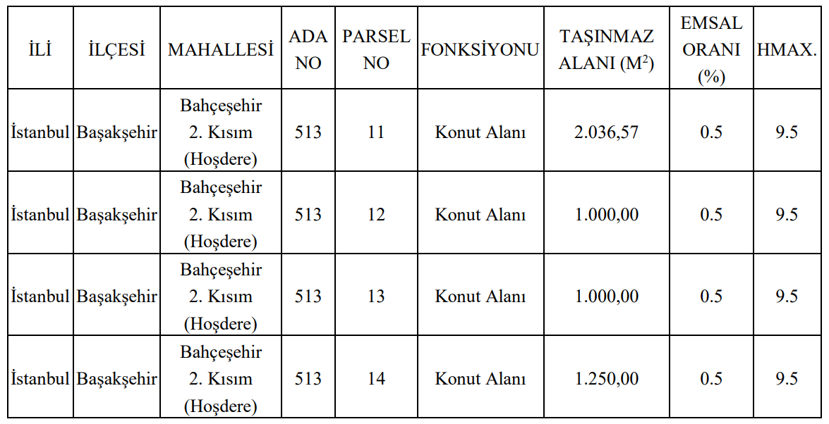 Kayabaşı Mahallesi'nde yer alan arsanın muhammen bedeli 122 milyon TL, geçici teminat bedeli 3 milyon 660 bin TL olarak açıklanırken, Bahçeşehir 2. Kısım'da yer alan arsaların muhammen bedeli 72 milyon TL, geçici teminat bedeli ise 2 milyon 160 bin TL olarak açıklandı.