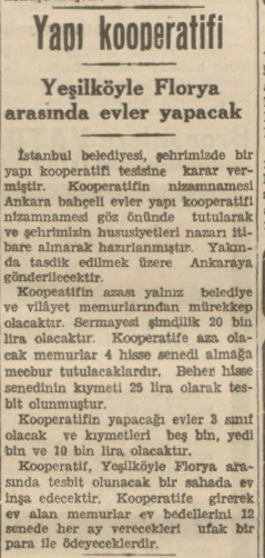 İstanbul Belediyesi 1942 yılında Yeşilköy ve Florya arasında evler inşa edecekmiş. Belediye proje için 20 bin lira sermaye ayrılmış. Daire fiyatları ise 5 bin ile 10 bin arasında satılacakmış...