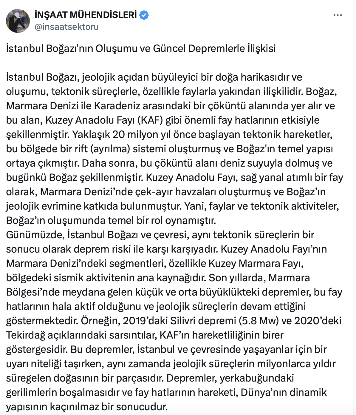 İnşaat Mühendisleri paylaşımında İstanbul Boğazı'nın oluşumu ve güncel depremlerle ilişkisine değinerek, İstanbul Boğazı’nın jeolojik açıdan büyüleyici bir doğa harikasıdır ve oluşumu olduğunu belirterek, tektonik süreçlerle, özellikle faylarla yakından ilişkili olduğunu söyledi.