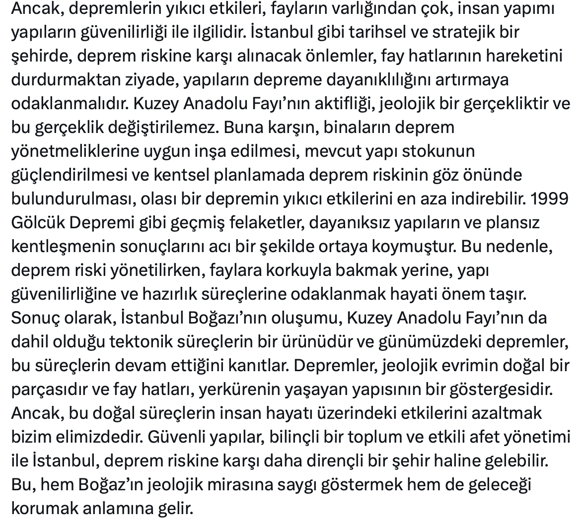 Ancak, bu doğal süreçlerin insan hayatı üzerindeki etkilerini azaltmak bizim elimizdedir. Güvenli yapılar, bilinçli bir toplum ve etkili afet yönetimi ile İstanbul, deprem riskine karşı daha dirençli bir şehir haline gelebilir. Bu, hem Boğaz’ın jeolojik mirasına saygı göstermek hem de geleceği korumak anlamına gelir.