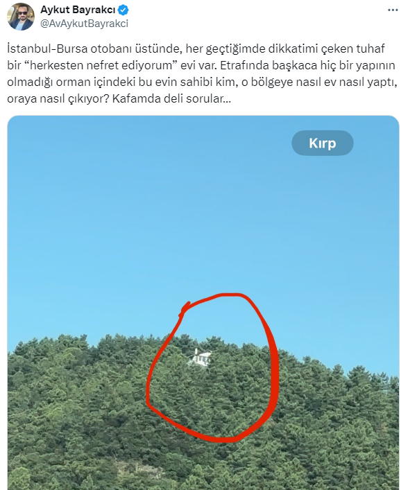 Avukat Aykut Bayrakçı, sosyal medya hesabı X'ten İstanbul-Bursa otobanı üstündeki dağın tepesinde yapılan ve kendisinden başka bir evin olmadığı adeta 'herkesten nefret ediyorum' modundaki evin foroğrafını paylaştı. Tüm sosyal medya evin sahibini ararken paylaşıma gelen ilginç yorumlar tebessüm ettirdi. Peki; bu ev kimin ve ne zaman yapılmış?