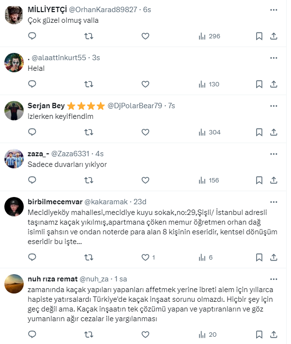 Kaçak olarak yapılan çok sayıda yapı, İstanbul Büyükşehir Belediyesi ekiplerince yıkıldı. Kaçak yapılar iş makineleriyle yıkılırken, zabıta ve güvenlik görevlileri de herhangi bir aksilik yaşanmaması adına yıkım esnasında hazır bulundu. Ayrıca kaçak yapılarla ilgili olarak idari para cezası da kesileceği öğrenildi. Yıkım vidoları sosyal medyada çığ gibi büyürken vatandaşlardan onlarca yorum geldi. Metropol Haber videoyu sosyal medya hesabı X'ten yayımladı. İşte o paylaşım ve gelen yorumlar..