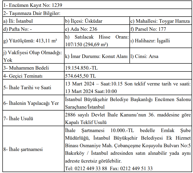 İstanbul ve Antalya'da yer alan gayrimenkuller için satış ihalesi düzenleniyor. İstanbul Büyükşehir Belediyesi tarafından satışa çıkarılan ve Üsküdar'da yer alan arsanın satış ihalesi 13 Mart 2024 tarihinde yapılacak.