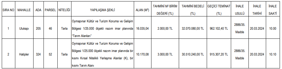 Mülkiyeti Belediyemize ait aşağıdaki tabloda Tapu bilgileri ve nitelikleri belirtilen taşınmazların 2886 sayılı Devlet İhale Kanunu'nun 35. maddesi