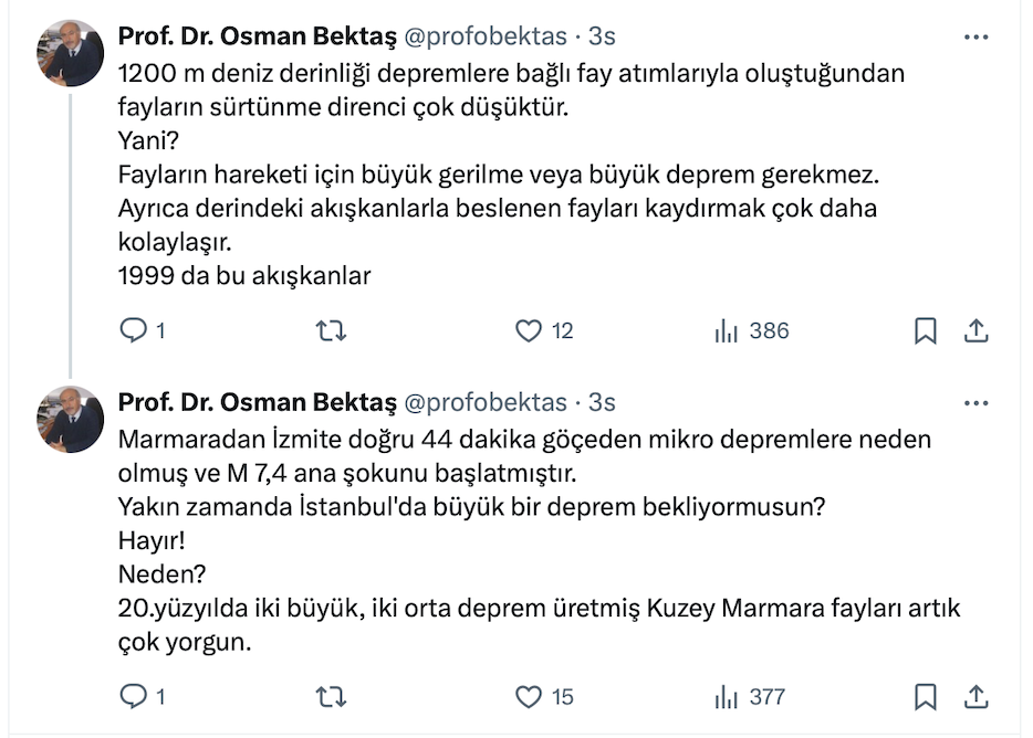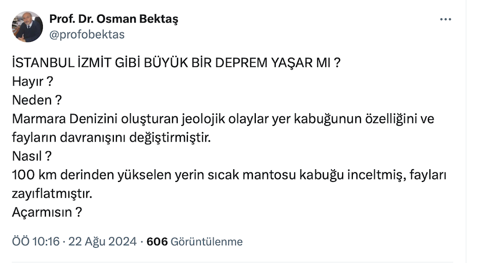 Deprem uzmanı Prof. Dr. Osman Bektaş, söz konusu paylaşımında şu ifadeleri kullandı: