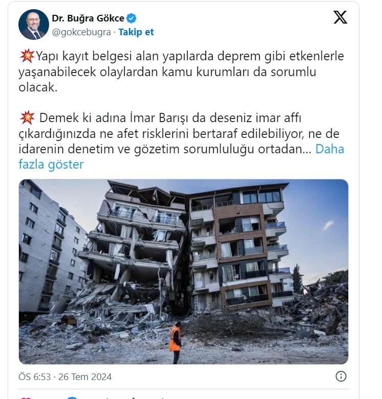 Gökce, "Demek ki adına İmar Barışı da deseniz imar affı çıkardığınızda ne afet risklerini bertaraf edilebiliyor, ne de idarenin denetim ve gözetim sorumluluğu ortadan kalkıyor. Sadece kaçak binlerce yapıya yasal statü verip bu yapıların depreme dirençli hale gelmeleri ihmal ediliyor ya da en hafif tabiriyle güçleştiriliyor" dedi.