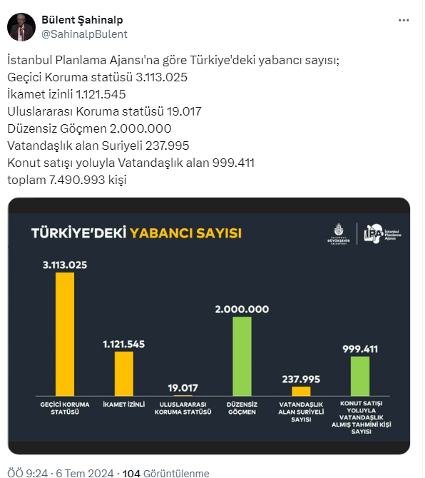 İstanbul Planlama Ajansı Türkiye'deki yabancı sayısını açıkladı. Türkiye'de toplam yabancı sayısı 7.490.993 kişi iken, bunların 999 bin 411 kişisi Türkiye'de konut satışıyla vatandaşlık alanlardan oluşuyor.