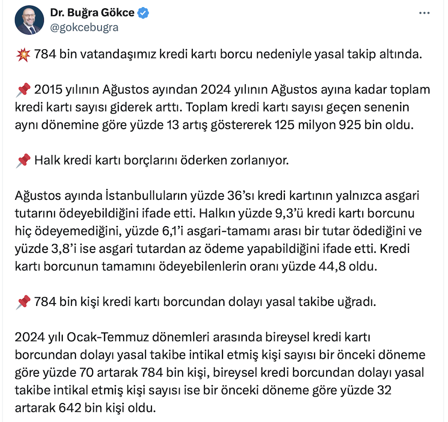 İstanbul Planlama Ajansı Başkanı Buğra Gökce resmi sosyal medya hesabı üzerinden yaptığı paylaşımda 784 bin kişinin kredi kartı borcu nedeniyle yasal takip altında olduğunu söyledi.