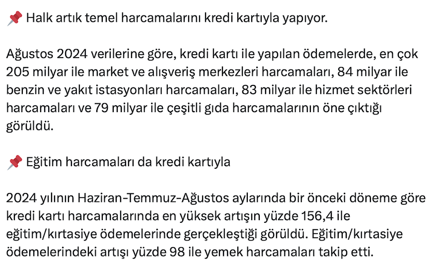 Ağustos 2024 verilerine göre, kredi kartı ile yapılan ödemelerde, en çok 205 milyar ile market ve alışveriş merkezleri harcamaları, 84 milyar ile benzin ve yakıt istasyonları harcamaları, 83 milyar ile hizmet sektörleri harcamaları ve 79 milyar ile çeşitli gıda harcamalarının öne çıktığı görüldü.
