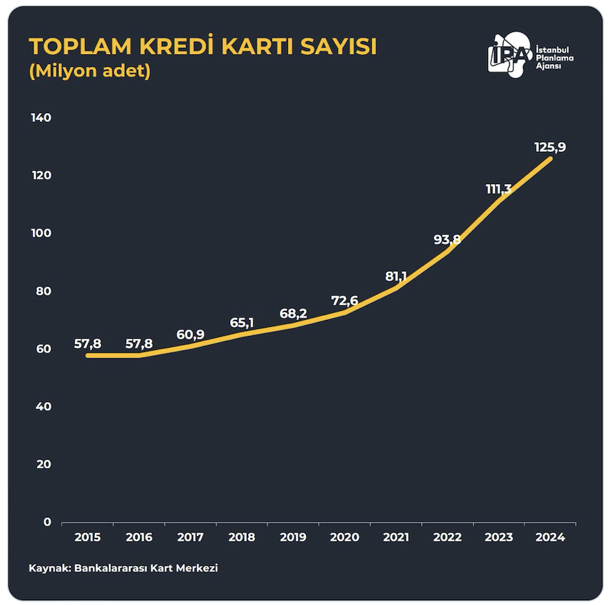 2015 yılının Ağustos ayından 2024 yılının Ağustos ayına kadar toplam kredi kartı sayısı giderek arttı. Toplam kredi kartı sayısı geçen senenin aynı dönemine göre yüzde 13 artış göstererek 125 milyon 925 bin oldu.
