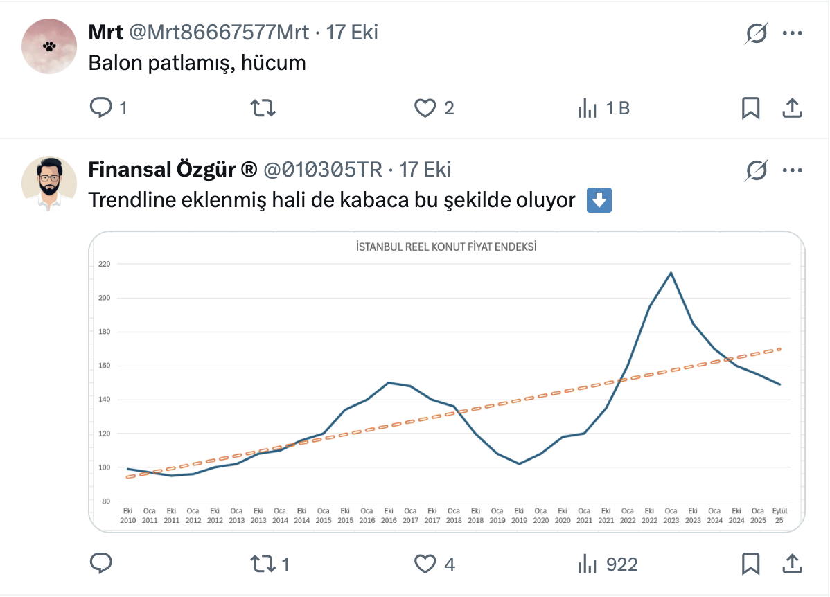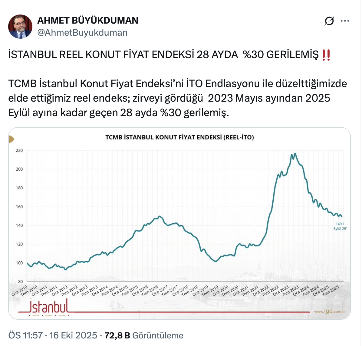 Ahmet Büyükduman resmi X hesabı https://x.com/AhmetBuyukduman üzerinden yaptığı paylaşımda İstanbul reel konut fiyat endeksi 28 ayda yüzde 30 gerilediğini belirtti.