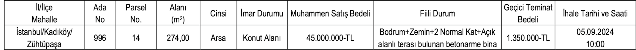 Konut alanı imarlı binanın muhammen bedeli 45 milyon TL olarak açıklanırken, geçici teminat bedeli 1 milyon 350 bin TL olarak açıklandı.