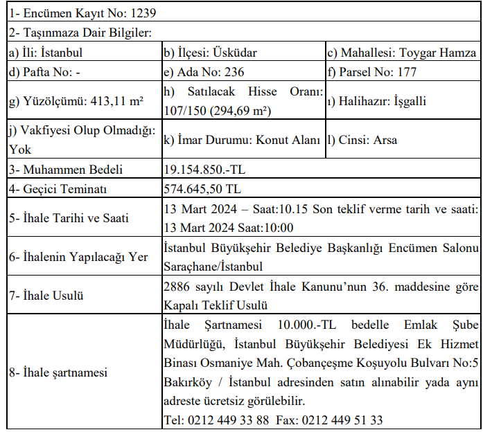 İstanbul ve Adana'da yer alan iki adet arsa satışa çıkarıldı. İstanbul Üsküdar'da yer alan arsanın muhammen bedeli 19 milyon 154 bin 850 TL olarak açıklanırken, geçici teminat bedeli ise 574 bin 645,50 TL olarak açıklandı.
