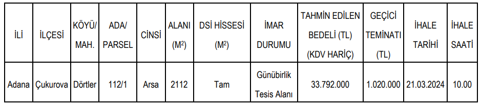 Adana Çukurova'da yer alan arsanın ise muhammen bedeli 33 milyon 792 bin TL olarak açıklanırken, geçici teminat bedeli ise 1 milyon 20 bin TL olarak açıklandı.