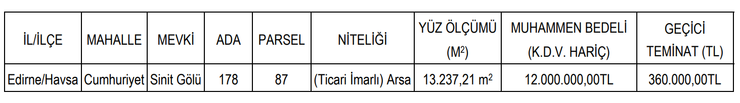 Edirne'de yer alan ticari imarlı arsanın muhammen bedeli 12 milyon TL, geçici teminat bedeli ise 360 bin TL olarak açıklandı.
