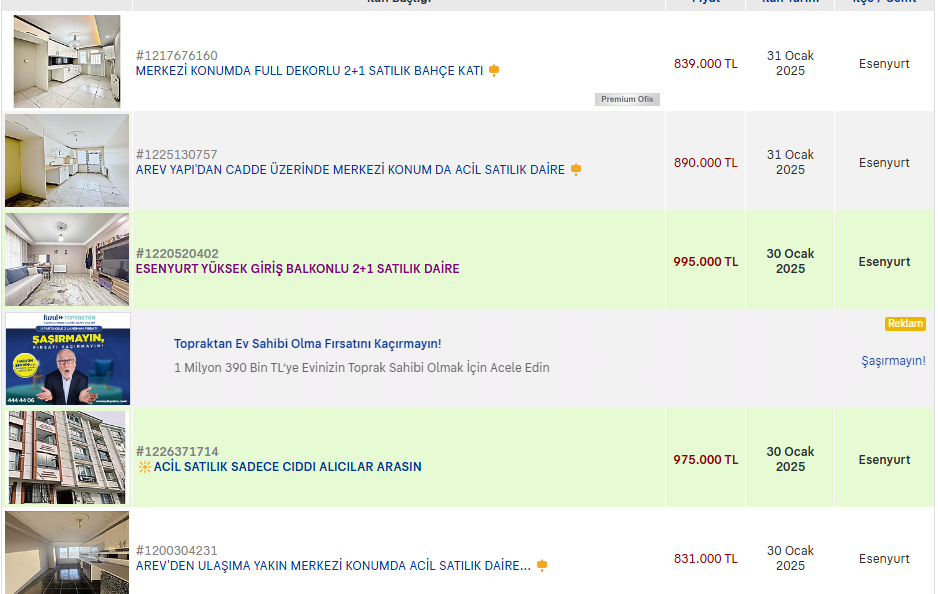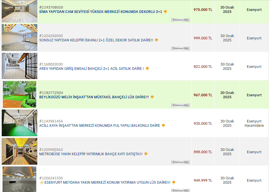 Sahibinden'de yer alan ilanlar içinde sadece İstanbul'da 289 konut, 1 milyon liranın aldında satılıyor. Bu listenin ilk on sırasında ise Esenyurt geliyor. İlanlarda, 'ACİL SATILIK, MERKEZİ KONUM, ÖZEL DEKOR YAPILMIŞ, FULL YAPILI DAİRE'' gibi ayrıntıların da yazıldığı dikkat çekiyor.