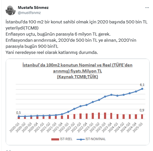 Merkez Bankası tarafından açıklanan Konut Fiyat Endeksi verilerine göre değerlendirmelerde bulunan Sönmez '' İstanbul'da 100 metrekare bir konut sahibi olmak için 2020 başında 500 bin TL yeterliydi.''ifadesini kullandı. Enflasyonla beraber son beş yılda 500 bin liralık 100 metrekare bir konutun şu anda 6 milyona satıldığını açıklayan Sönmez, reel olarak katlandığını belirtti.