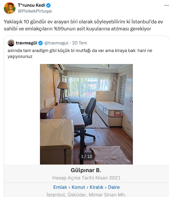 Yaklaşık 10 gündür ev arayan biri olarak söyleyebilirim ki İstanbul'da ev sahibi ve emlakçıların %99unun asit kuyularına atılması gerekiyor