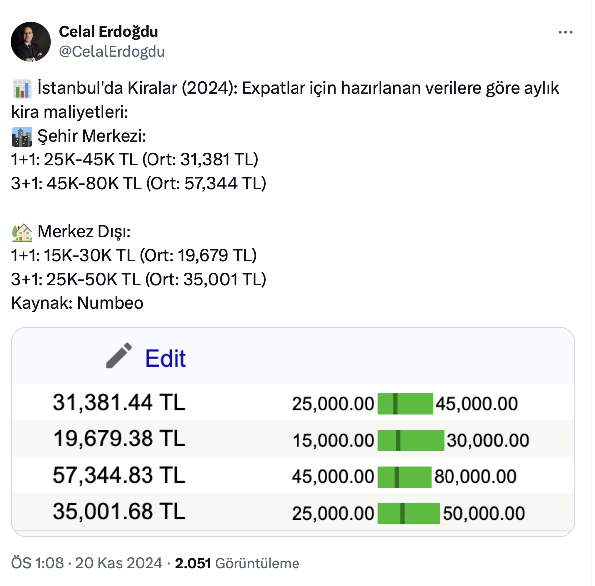 Şehir Plancısı ve Gayrimenkul Değerleme Uzmanı Celal Erdoğdu resmi X hesabı https://twitter.com/CelalErdogdu üzerinden İstanbul’daki kira bedelleri ile ilgili bir paylaşım yaptı.