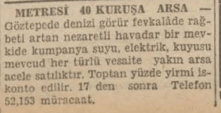 - Göztepe'de denizi görür fevkalåde rağbeti artan nezaretli havadar bir mevkide kumpanya suyu, elektrik, kuyusu mevcut her türlü vesaite yakın arsa acele satılıktır. Toptan yüzde yirmi ıskonto edilir. 17 den sonra Telefon 52,153 müracant.