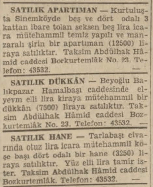 SATILIK HANE -Tarlabaşı elvarında otuz lira Icara mütehammil köşe başı dört odalı bir hane (3250) 11- raya satılıktır. Yüz elli lira tamir ister. Taksim Abdülhak Hamid caddesi Bozkurtemlik. Telefon: 43532.