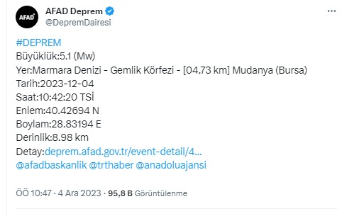 | 04-12-2023 10:42:20 | 40.4269 | 28.8319 | 8.98 | MW | 5.1 | Marmara Denizi - Gemlik Körfezi - [04.73 km] Mudanya (Bursa) | 611620 |
