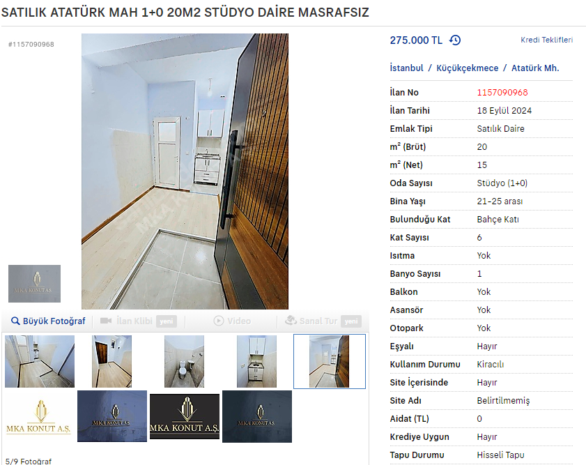 Sahibinden.com'daki İstanbul'un en ucuz evin metrekaresi bürüt 20, net 15 metrekare olarak belirtilmiş. 20-25 yaşında olan bu evin tipi ise Stüdyo (1+0) . 6 katlı binanın bahçe katında yer alan bu evde ısıtma ve balkon bulunmuyor.
