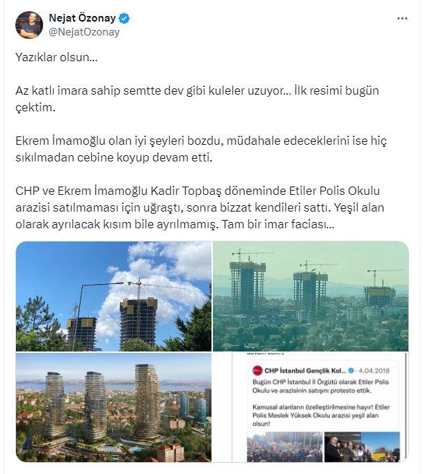 CHP ve Ekrem İmamoğlu Kadir Topbaş döneminde Etiler Polis Okulu arazisi satılmaması için uğraştı, sonra bizzat kendileri sattı. Yeşil alan olarak ayrılacak kısım bile ayrılmamış. Tam bir imar faciası…