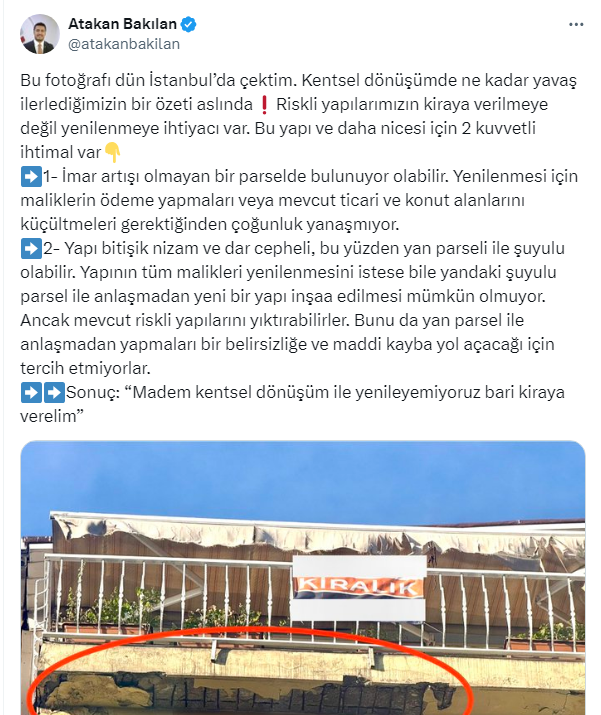 Bakılan ''Riskli yapılarımızın kiraya verilmeye değil yenilenmeye ihtiyacı var.'' diyerek bu evlerin neden kentsel dönüşüme verilmeyip kiralandığını iki ihtimalle açıkladı. İşte Atakan Bakılan'ın sosyal medya hesabı X'ten yaptığı o paylaşım...