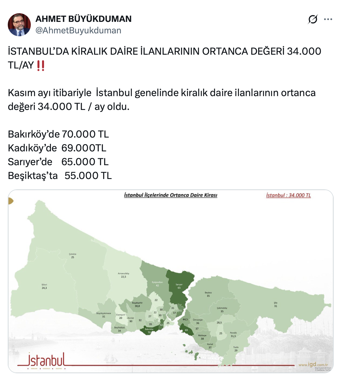 Ahmet Büyükduman resmi X hesabı https://x.com/AhmetBuyukduman üzerinden yaptığı paylaşımda İstanbul’da kiralık daire ilanlarının ortanca değeri 34 bin TL olduğunu belirtti.