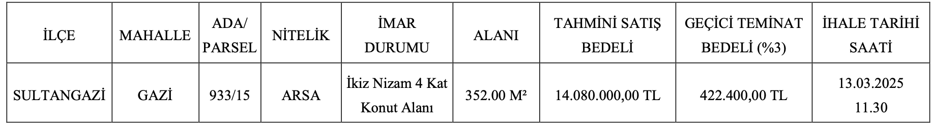 Gazi Mahallesi’nde yer alan arsanın satış ihalesi 13 Mart 2025 tarihinde saat 11.30’da Sultangazi Belediyesi 2. Kat Encümen Odası’nda yapılacak.