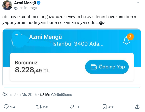 abi böyle aidat mı olur gözünüzü seveyim bu ay sitenin havuzunu ben mi yaptırıyorum nedir yani buna ne zaman isyan edeceğiz.
