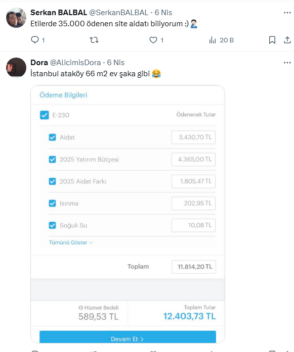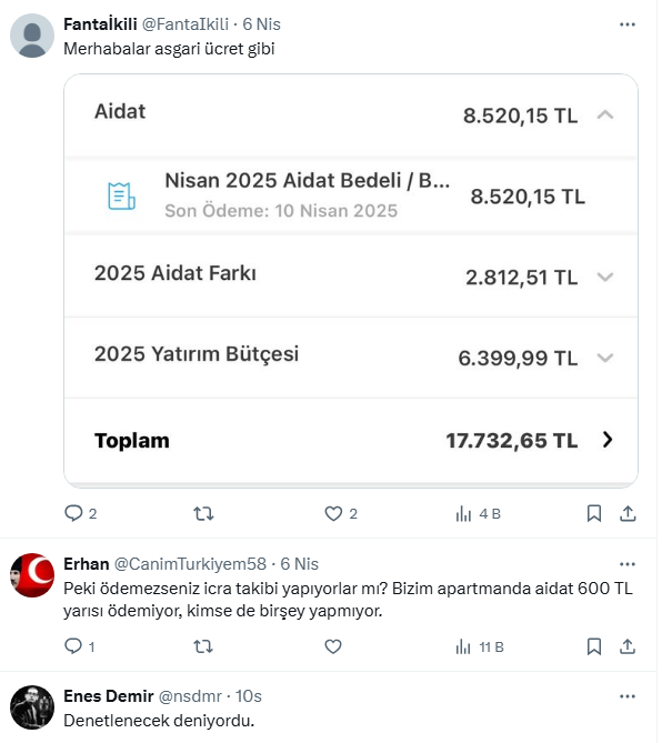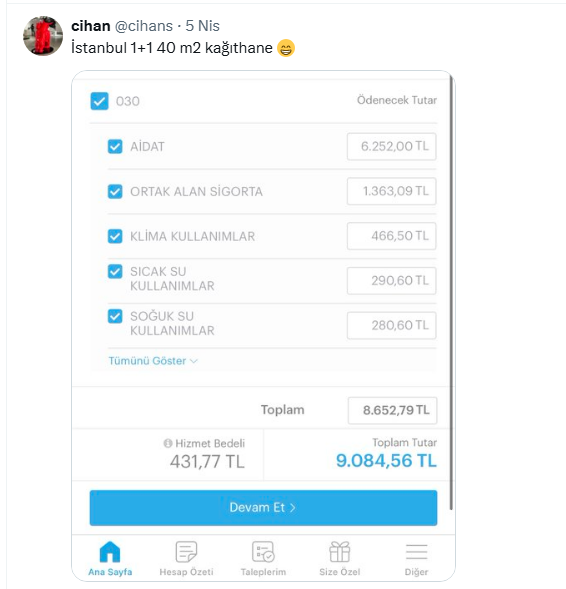 Başka bir site sakini ise Kağıthane'de 1+1 40 metrekarelik ev için 9084 lira aidat ödediğini açıkladı. İşte vatandaşlardan gelen site aidat ücreti paylaşımları...