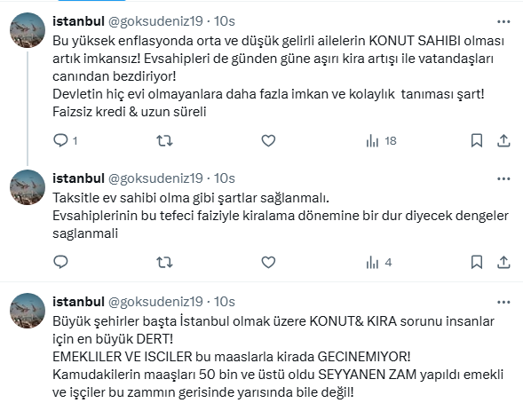 Ülke genelinde barınma büyük sorun haline geldi. Özellikle büyükşehirlerde kirada oturmak veya ev sahibi olmak gittikçe zorlaşıyor. Yüksek enflasyon karşısında orta ve düşük gelirlilerin konut sahibi olması artık imkansız hale geldi.
