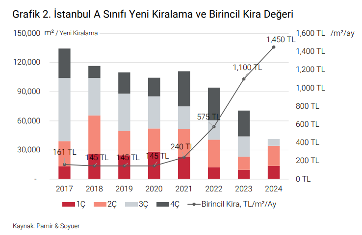Pamir-Soyuer Real Estate 2024 yılı 3. çeyrek Türkiye Gayrimenkul Sektörü raporuna göre; İstanbul ana ofis bölgelerindeki A sınıfı ofis arzı değişmeyerek 5.27 milyon metrekare olarak belirlendi.
