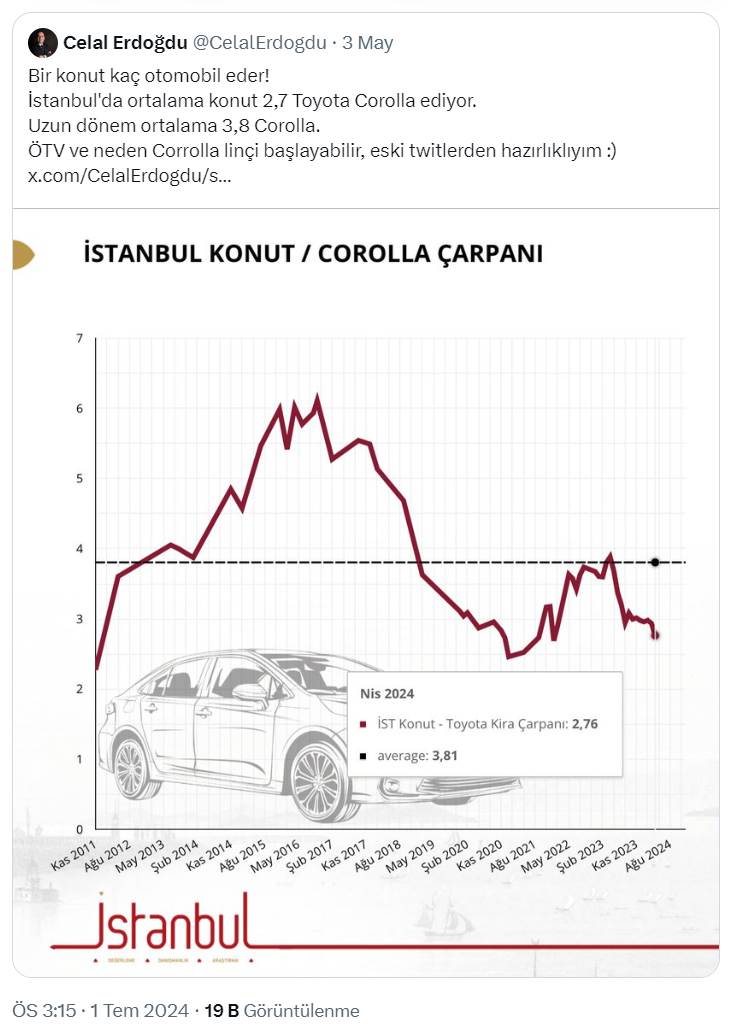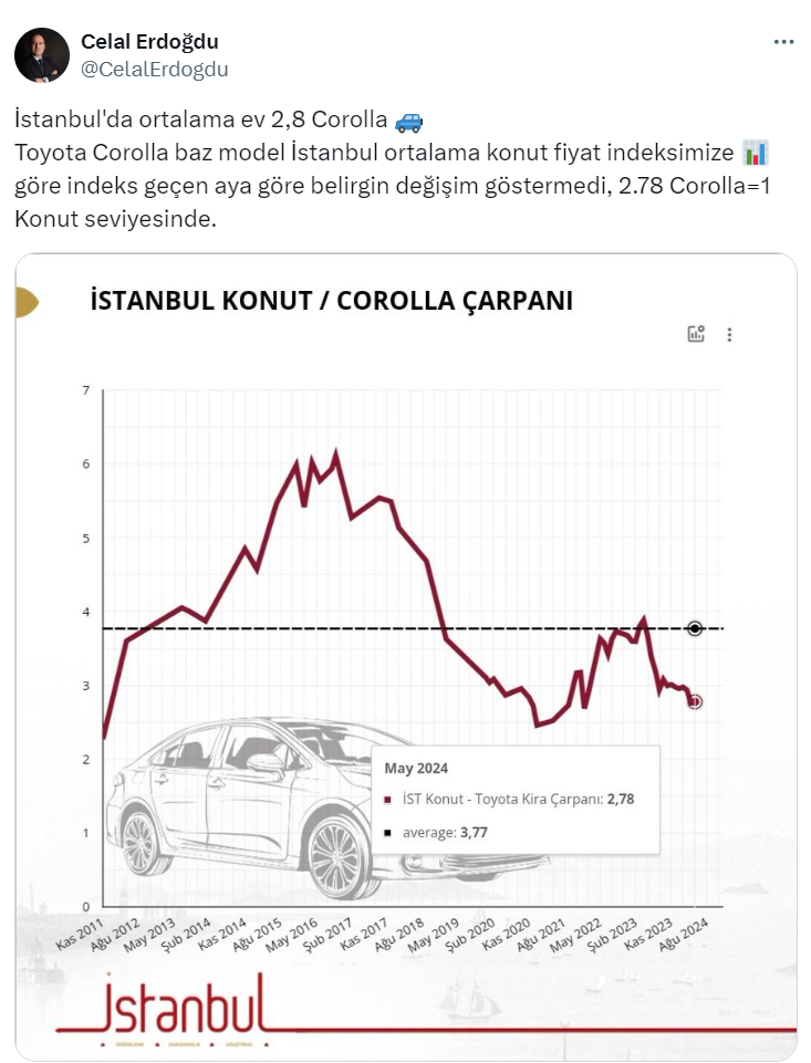 Celal Erdoğdu sosyal medya hesabından paylaşımda Toyota Corolla baz model İstanbul ortalama konut fiyat indeksine göre indeksin geçen aya göre belirgin değişim göstermediğini belirterek, İstanbul'da ortalama bir evin 2,8 Toyota Corolla ettiğini belirtti.