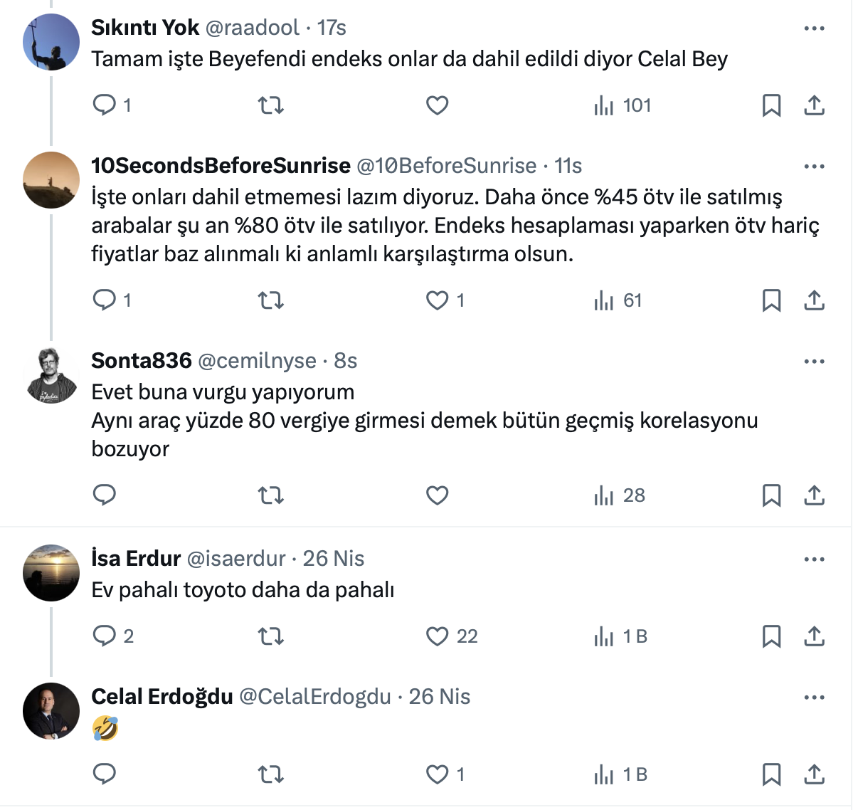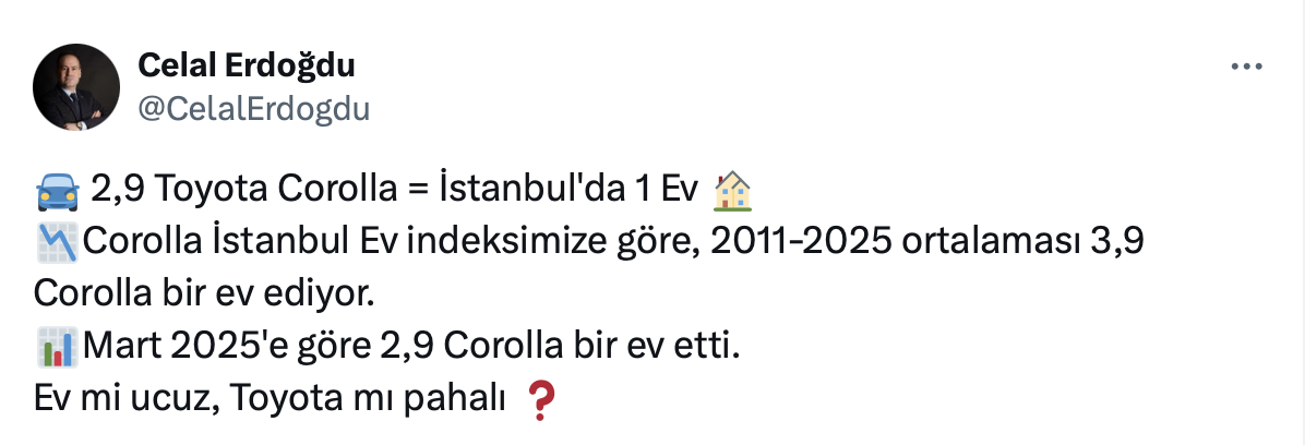 Celal Erdoğdu yaptığı paylaşımda Corolla İstanbul Konut Fiyat İndeksi’ne göre mega kent İstanbul'da ortalama bir konutun 2,9 Toyota Corolla ettiğini açıkladı.
