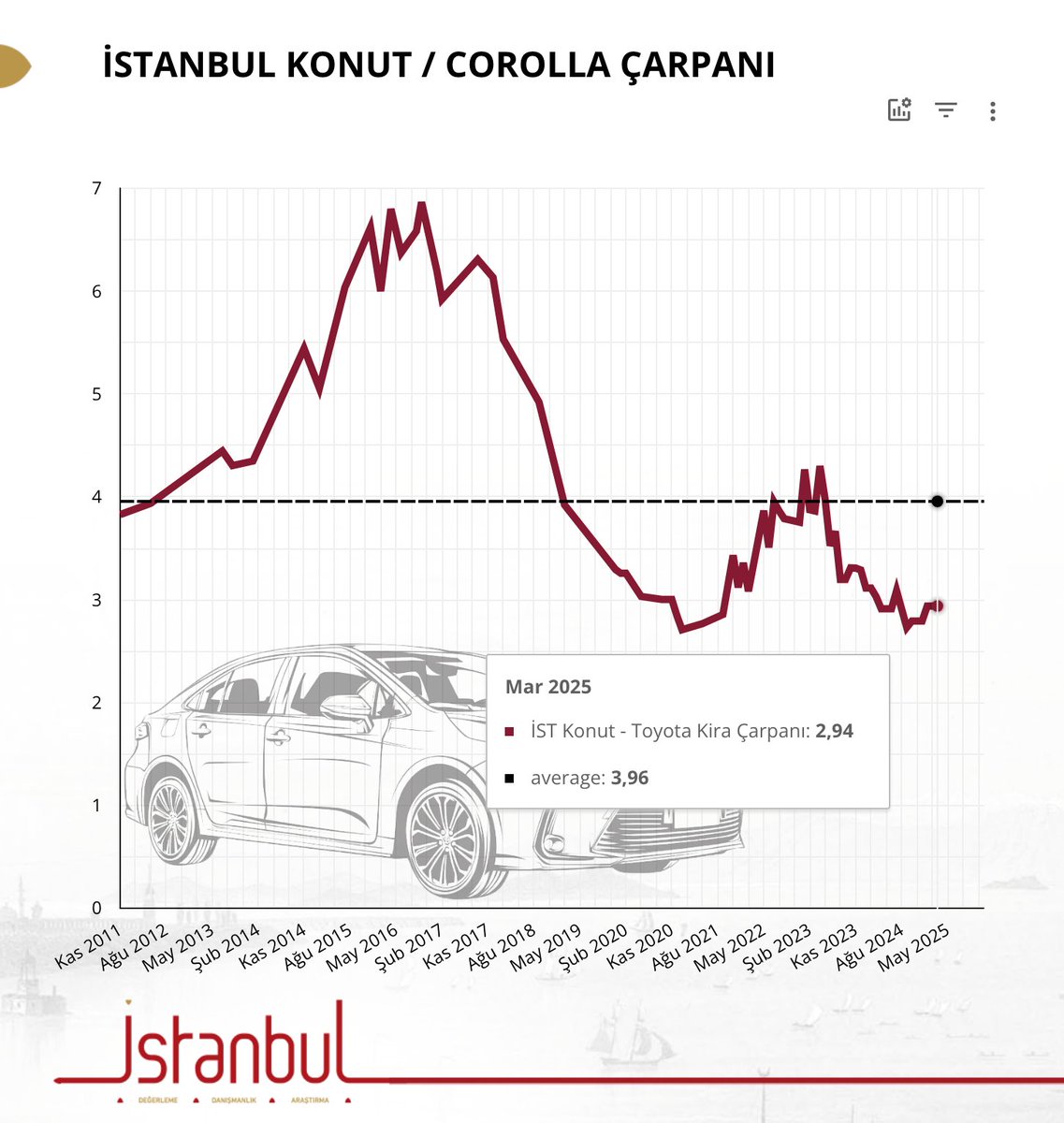 Corolla İstanbul Ev indeksimize göre, 2011-2025 ortalaması 3,9 Corolla bir ev ediyor.
