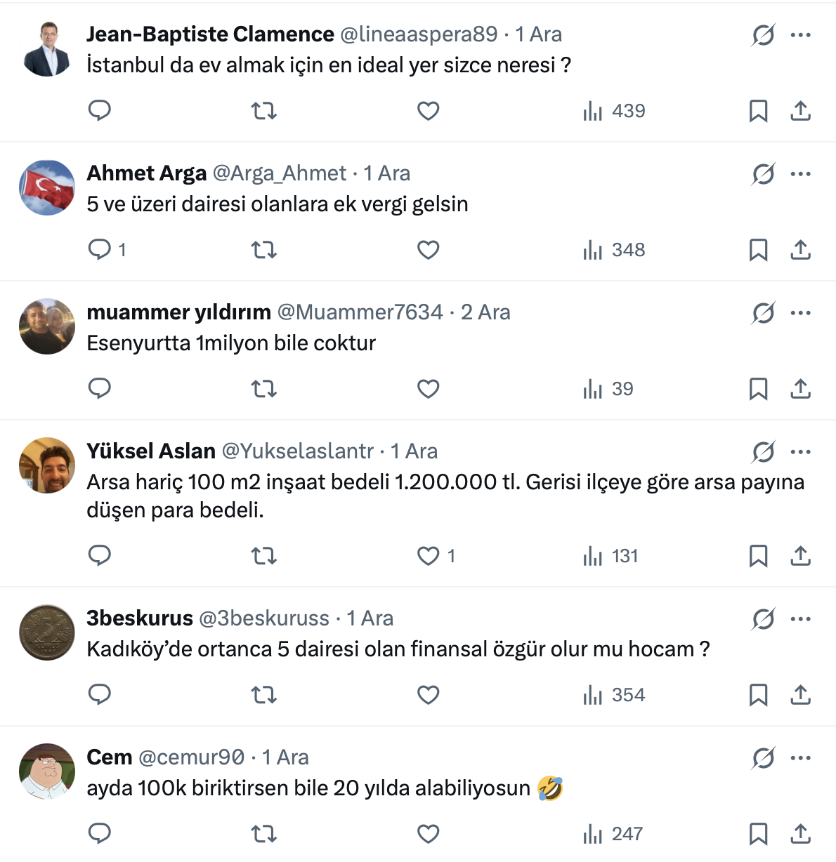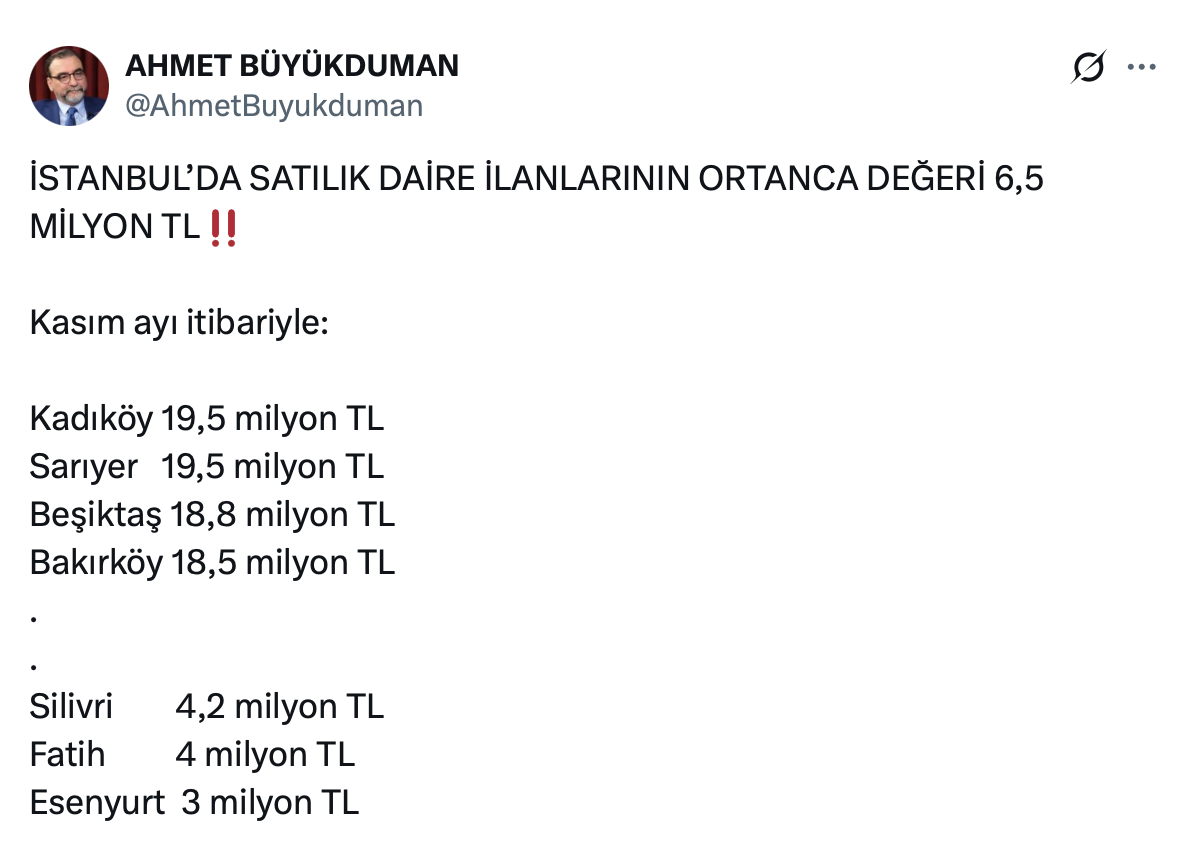 Ahmet Büyükduman resmi X hesabı https://x.com/AhmetBuyukduman üzerinden yaptığı paylaşımda İstanbul’da satılık daire ilanlarının ortanca değerinin 6,5 milyon TL olduğunu belirtti.