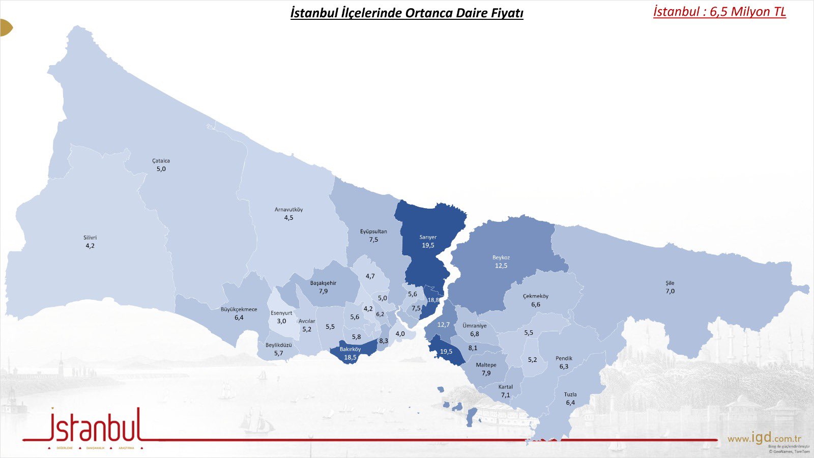 İSTANBUL’DA SATILIK DAİRE İLANLARININ ORTANCA DEĞERİ 6,5 MİLYON TL