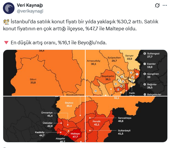 Veri Kaynağı, sosyal medya hesabı X'ten İstanbul'da satılık konut fiyatlarının bir yılda yaklaşık yüzde 30,2 arttığını açıkladı.