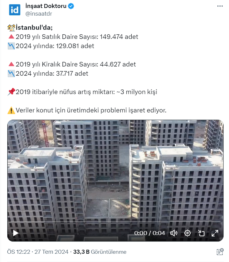 Sektör ile ilgili olarak yaptığı paylaşımlarla dikkat çeken İnşaat Doktoru resmi X hesabı https://twitter.com/insaatdr üzerinden İstanbul'daki satılık ve kiralık konut sayısını paylaştı.
