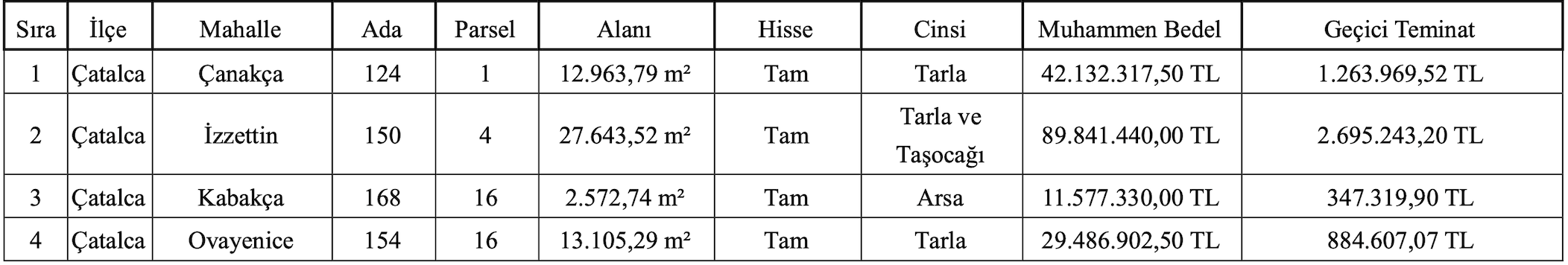 Çatalca Belediye Başkanlığı, İstanbul Çatalca’da yer alan dört adet arsa ve araziyi satışa çıkardı. Arsa ve arazilerin satış ihalesi 22 Ekim’de yapılacak.