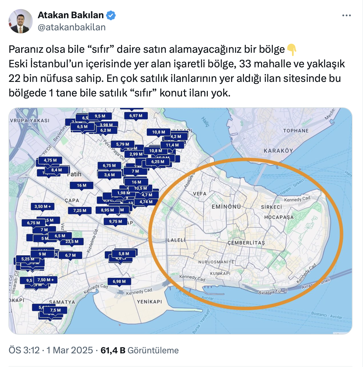 Atakan Bakılan resmi X hesabı https://x.com/atakanbakilan üzerinden yaptığı paylaşımda İstanbul’da paranız olsa bile “sıfır” daire satın alamayacağınız bölgeyi açıkladı.